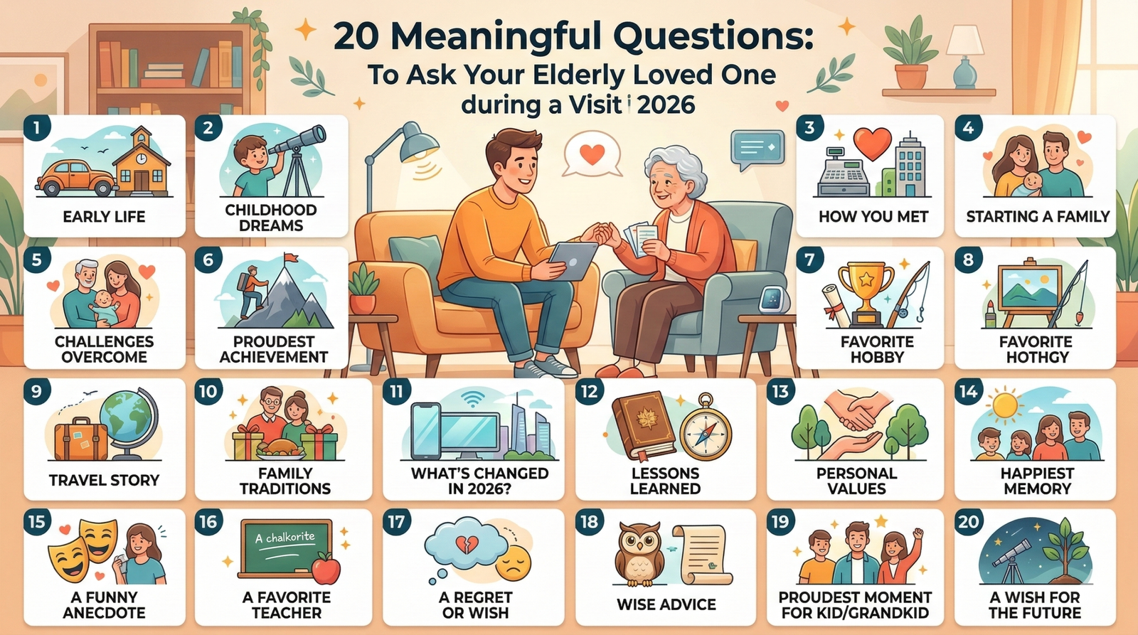 Discover 20 Meaningful Questions to Ask Your Elderly Loved One during a Visit in 2026. What are 20 significant inquiries to ask your aged cherished one at some point of a go to. Strengthening bonds, spark recollections, and help their intellectual wellness today.
