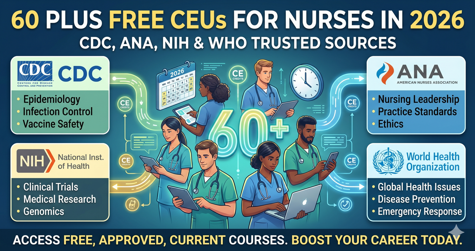 CDC, ANA, NIH & WHO Trusted Sources: 60 Plus Free CEUs for Nurses in 2026