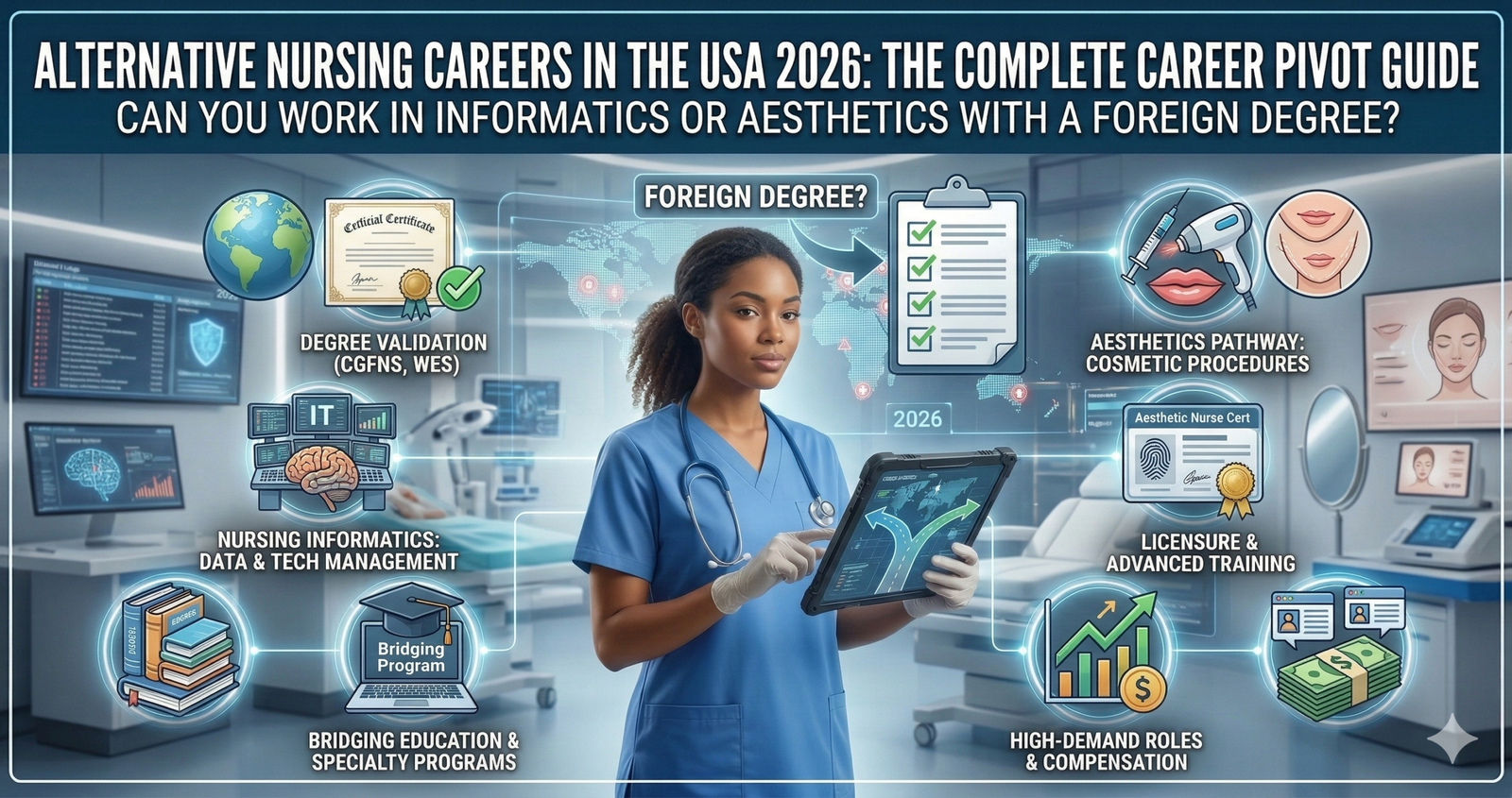 Explore Alternative Nursing Careers in the USA 2026: Can You Work in Informatics or Aesthetics with a Foreign Degree? The Complete Career Pivot Guide. Opportunity nursing careers with inside the USA in 2026 — find out how foreign-diploma nurses can transition into informatics or aesthetics with the proper steps & certifications.