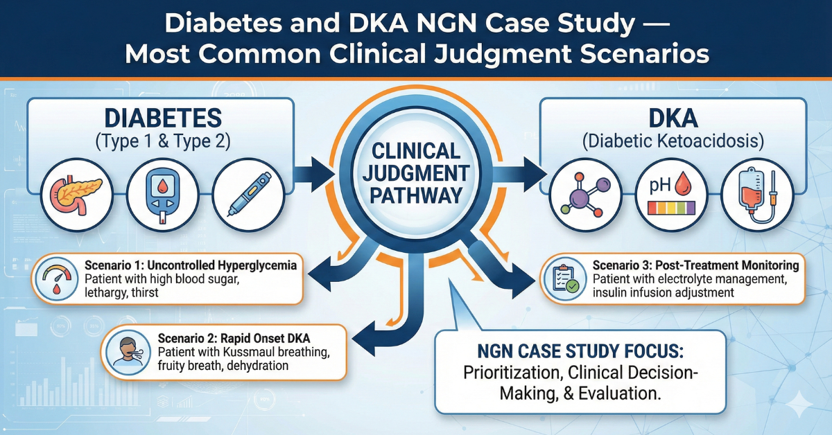 Explain Diabetes and DKA NGN Case Study — Most Common Clinical Judgment Scenarios. Master diabetes and DKA NGN case research for NCLEX success. Learn scientific judgment abilities via sensible scenarios, precedence interventions, and evaluation strategies.