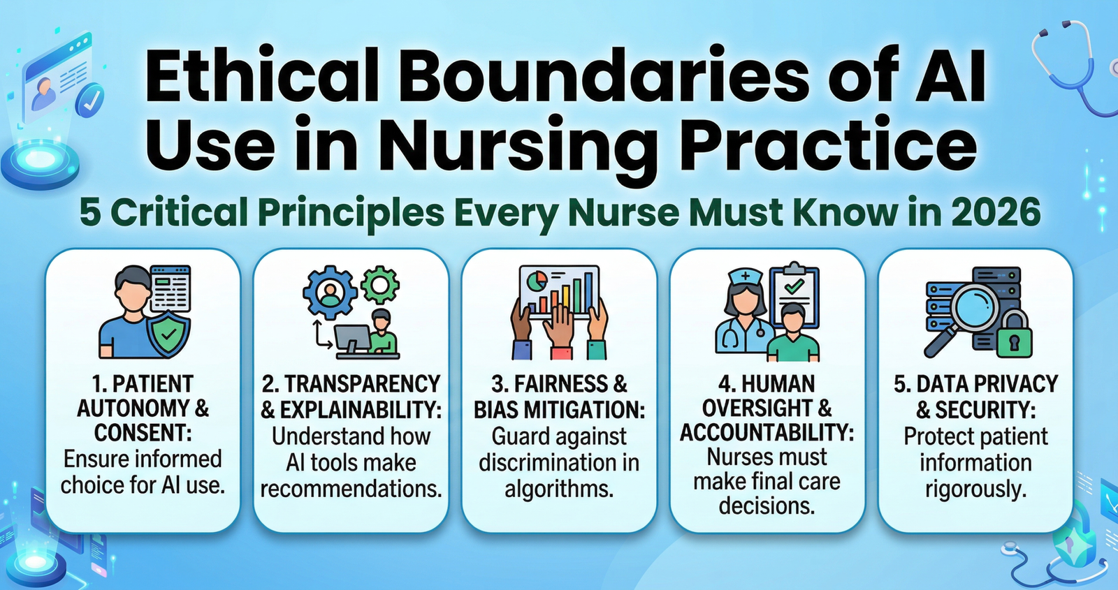 Explore Ethical Boundaries of AI Use in Nursing Practice: 5 Critical Principles Every Nurse Must Know in 2026. The moral limitations of AI use in nursing exercise in 2025. Learn how nurses can shield affected person autonomy, privacy, and human-focused care within the AI era.