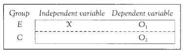 Using this model, the investigator hypothesizes the independent variable and then compares two groups, an experimental group (E) which has been exposed to the presumed independent variable and a control group (C) which has not. (The dashed line in the model shows that the comparison groups E and C are not equated by random assignment.) Alternatively, she may examine two groups that are different in some way or ways and then try to account for the difference or differences by investigating possible antecedents.