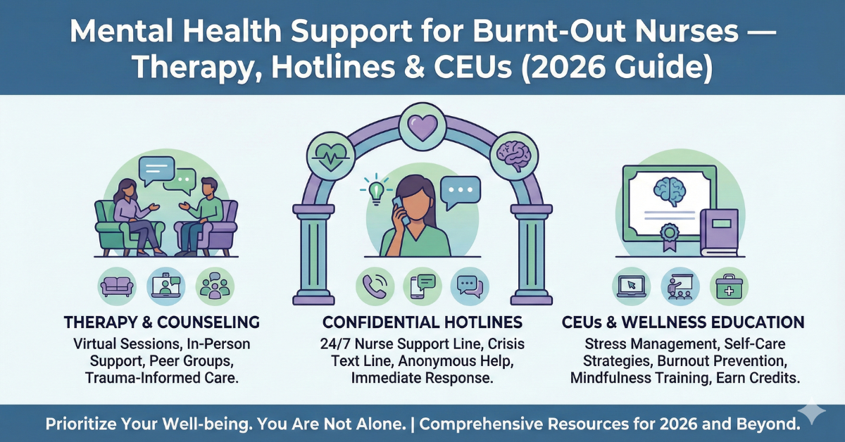 Therapy, Hotlines & CEUs (2026 Guide) — Mental Health Support for Burnt-Out Nurses