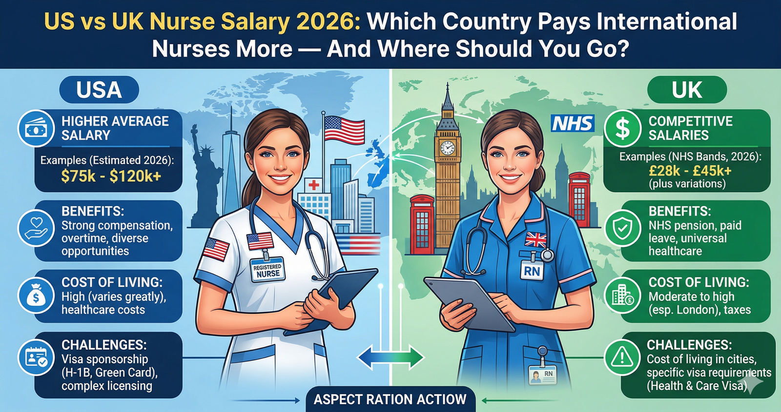 Comparing US vs UK Nurse Salary 2026: Which Country Pays International Nurses More — And Where Should You Go? US vs UK nurse revenue in 2026? Discover actual RN pay figures, NHS band rates, visa pathways, and which US Without a doubt wins for global nurses.